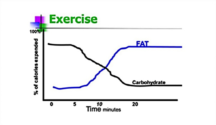 이 그래프는 운동 시간이 지남에 따라 지방과 탄수화물에서 소모되는 칼로리의 비율을 보여줍니다. 20분이 지나면 지방 연소가 시작된다는 것을 알 수 있습니다.