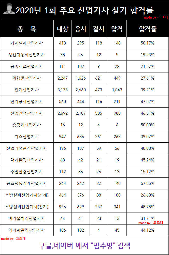 여기에는 다양한 산업 인증 시험의 합격률이 나와 있으며, 각 시험의 난이도를 비교하는 데 유용합니다.