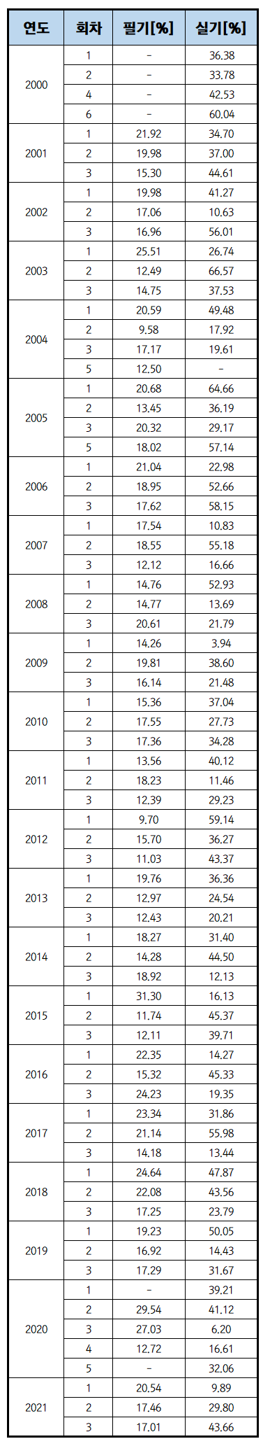 시험의 난이도를 평가하기 위해 실기 시험의 합격률을 참고하는 것은 매우 유용합니다. 아래 표는 전기기사와 전기산업기사의 실기 합격률을 비교한 자료입니다.