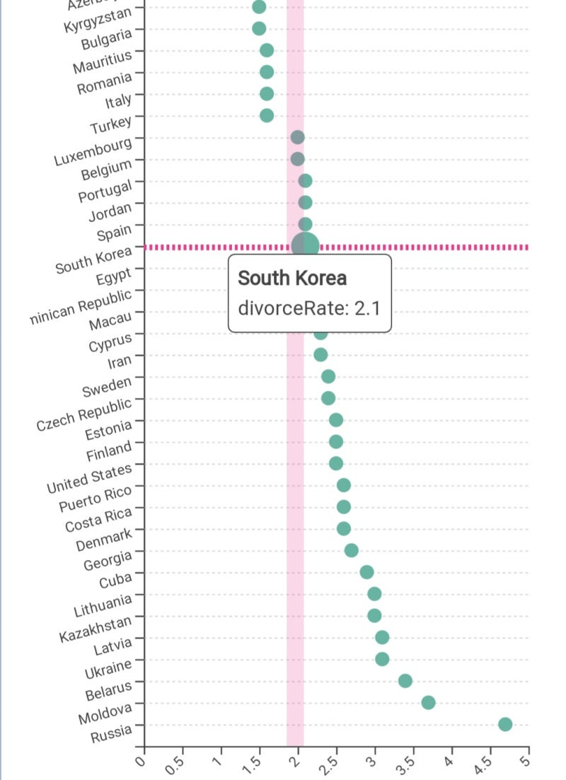 이 통계에 따르면, 몰도바가 5.52로 가장 높은 이혼율을 기록하였고, 그 뒤를 이어 카자흐스탄(4.6)과 러시아(3.9)가 있습니다. 한국은 2.1로, 다른 국가에 비해 상대적으로 낮은 편입니다.
