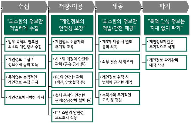 이 흐름도는 개인정보 보호를 위한 가이드라인을 제시합니다. 데이터 수집 시 최소한의 정보만 수집하고, 저장 및 사용 시 보안 조치를 철저히 하며, 데이터 제공 시에는 반드시 동의를 받아야 합니다. 마지막으로, 데이터 폐기 시에는 적절한 방법으로 삭제하여 무단 접근을 방지해야 합니다.