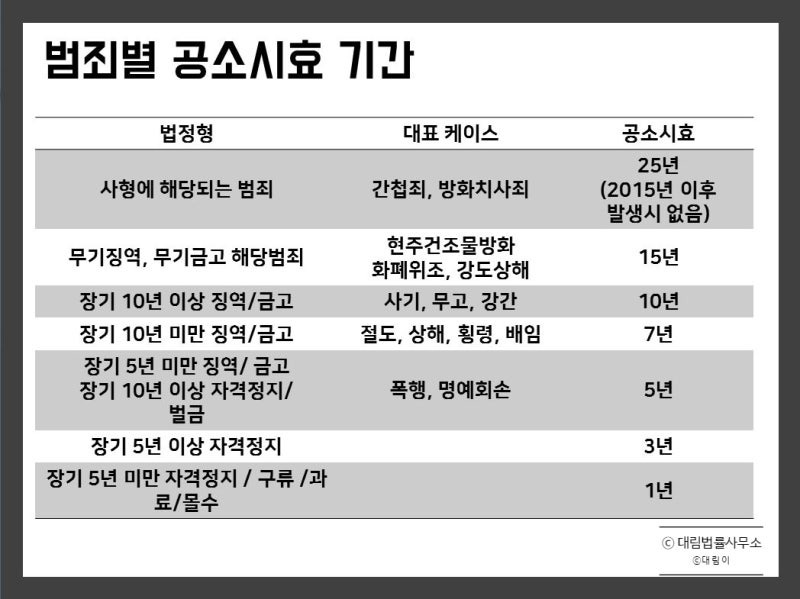 마지막으로 각 범죄의 공소시효 기간을 정리한 표를 아래에 첨부합니다. 이 표를 통해 폭행죄와 협박죄의 공소시효 기간을 한눈에 확인할 수 있습니다.