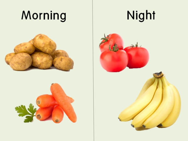 (이미지 설명: 아침과 저녁에 섭취할 과일을 비교한 슬라이드입니다.)