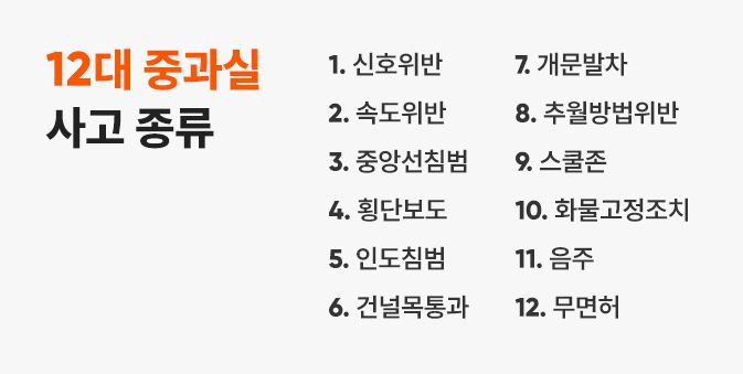 교통사고는 여러 가지 유형으로 나눌 수 있습니다. 다음은 12대 중과실 사고 종류입니다.