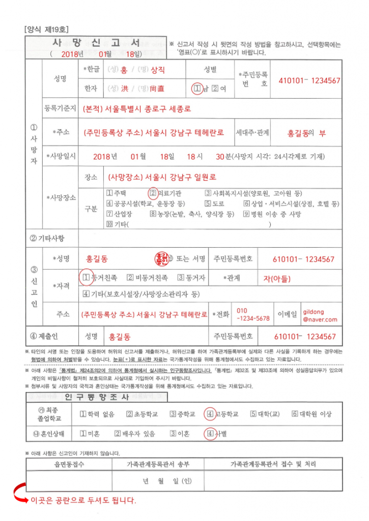 1. 사망자 확인: 사망자의 사망 사실을 확인합니다. 사망 신고서를 작성하여 제출해야 합니다.
