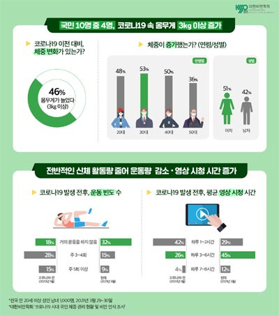 최근 COVID-19 팬데믹은 우리 생활에 큰 변화를 가져왔습니다. 많은 사람들이 집에 머물면서 신체 활동이 줄어들고, 오히려 간편식이나 배달 음식을 통해 칼로리 섭취가 증가하는 경향을 보였습니다. 조사에 따르면, 응답자의 46%가 체중 변화가 있었다고 하며, 이 중 상당수가 3kg 이상의 체중 증가를 경험했다고 합니다