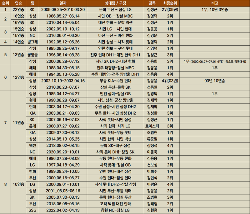 이러한 기록들은 단순히 숫자에 그치지 않고, 각 팀의 역사와 팬들의 기억 속에 깊이 새겨져 있습니다. 연승 기록은 팀의 전통과 자부심을 상징하며, 팬들에게는 특별한 의미를 지닙니다.