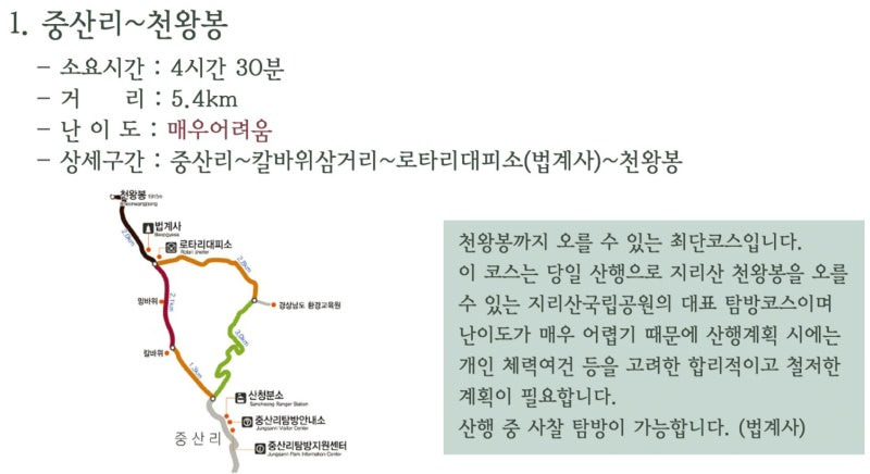 천왕봉으로 가는 등산 코스는 여러 가지가 있지만, 가장 많이 이용되는 코스는 중산리 코스입니다. 이 코스는 중산리 주차장에서 출발하여 칼바위, 로타리를 거쳐 천왕봉에 도달하는 경로입니다. 전체 거리 약 10.8km로, 왕복 소요 시간은 약 8시간 정도로 예상됩니다.