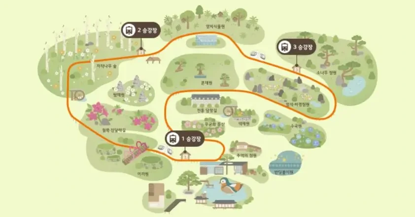 - 테마원 코스 : 약 60분 소요, 다양한 테마의 정원을 즐길 수 있습니다.