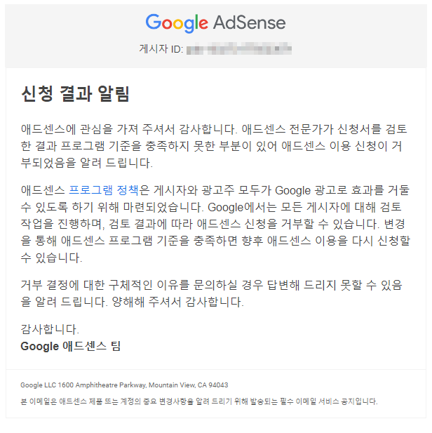 애드센스 신청 결과 알림을 보여주는 이미지입니다.