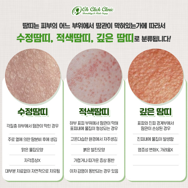 깊은 땀띠 : 피부가 두꺼운 부위에 깊이 발생하며, 염증이 심해져 통증을 동반하는 경우입니다. 이 경우에는 적절한 치료가 필요할 수 있습니다.