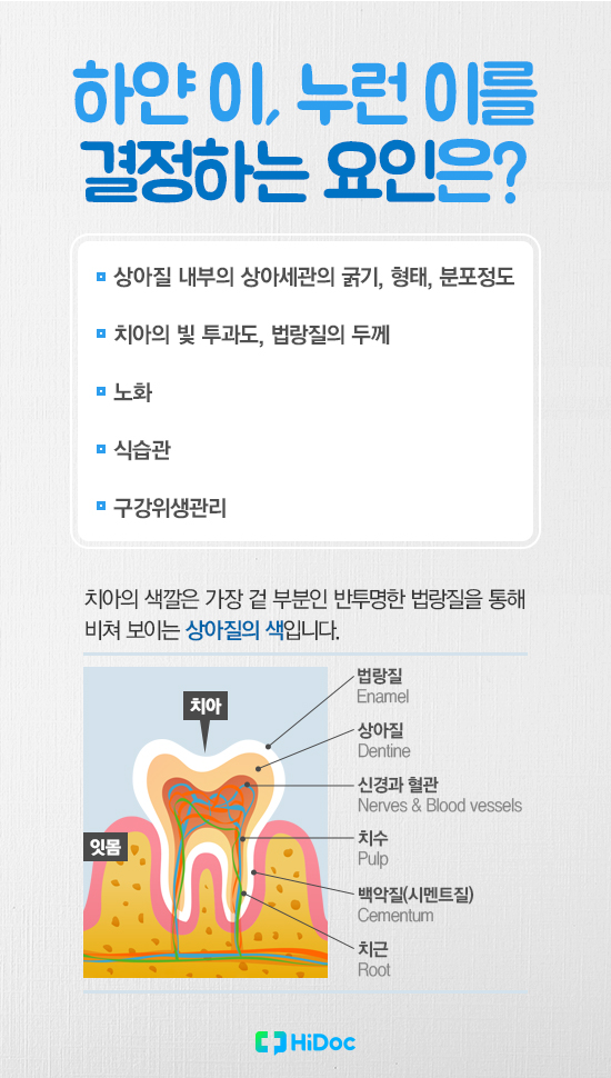 - 구강 위생 : 불량한 구강 위생은 치석이 쌓여 치아가 변색될 수 있습니다. 규칙적인 칫솔질과 치실 사용이 필요합니다.