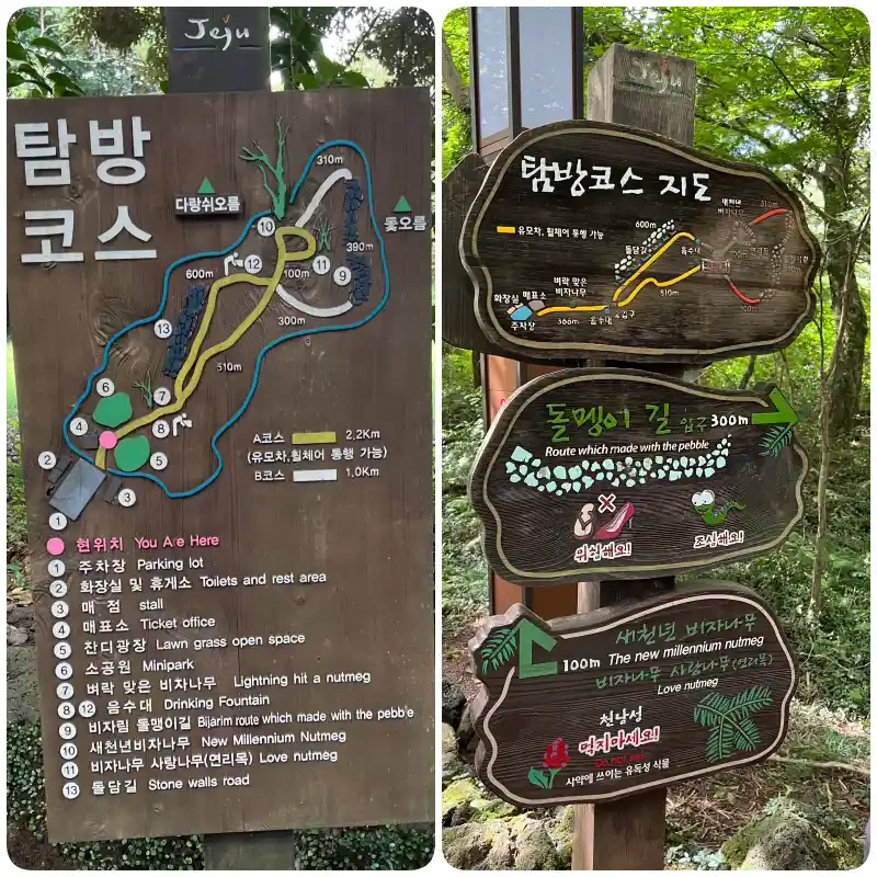 비자림에는 여러 탐방 코스가 마련되어 있어, 방문객들이 편리하게 숲을 탐방할 수 있습니다. A코스는 2.2km로, 비자림의 주요 명소를 둘러볼 수 있는 코스입니다. B코스는 1.0km로, 짧은 시간 안에 비자림의 아름다움을 느낄 수 있는 코스입니다. 각 코스는 잘 정비된 산책로로 이루어져 있어, 누구나 쉽게 걸을 수 있습니다.