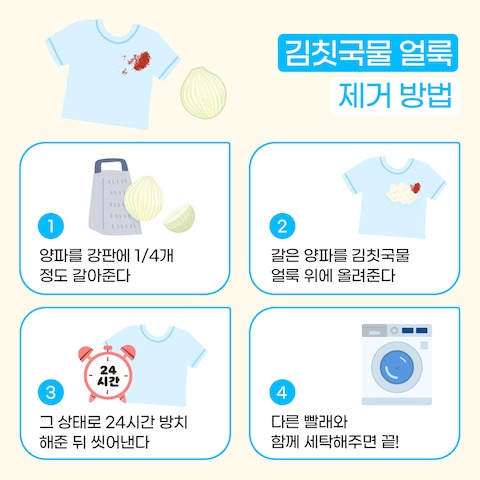 - 김치 얼룩 제거 : 양파를 갈아서 얼룩에 바르고 24시간 동안 두었다가 세탁합니다.