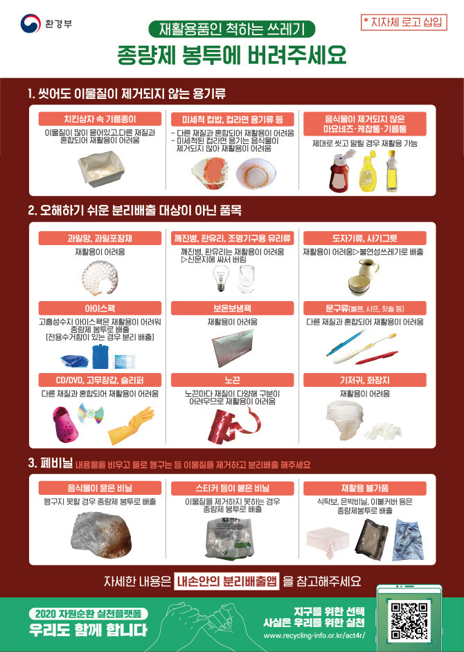 - 재활용 불가능한 품목 : 음식물 쓰레기, 비닐랩, 혼합 재질의 포장재 등