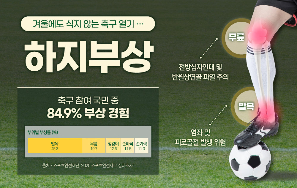 축구는 빠른 움직임과 방향 전환이 많은 스포츠입니다. 이러한 특성 때문에 발목 부상이 자주 발생합니다. 실제로 축구를 하는 사람들 중 84.9%가 부상을 경험했으며, 그 중 45.3%가 발목 부상으로 나타났습니다.