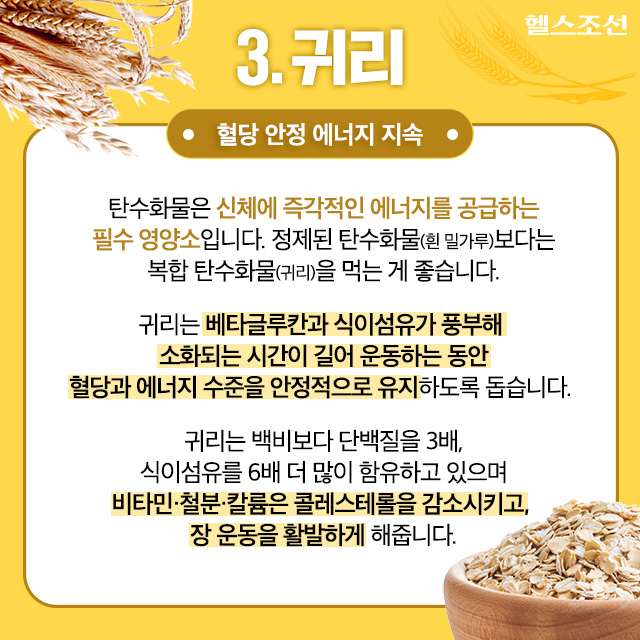 귀리는 에너지를 공급하는 데 매우 효과적인 식품입니다. 귀리는 식이섬유와 단백질이 풍부하여 운동 중 지속적인 에너지를 제공합니다. 특히, 귀리는 혈당 수치를 안정시키는 데 도움을 주어 운동 중 피로감을 줄여줍니다. 귀리를 아침 식사로 섭취하면 하루를 활기차게 시작할 수 있습니다.