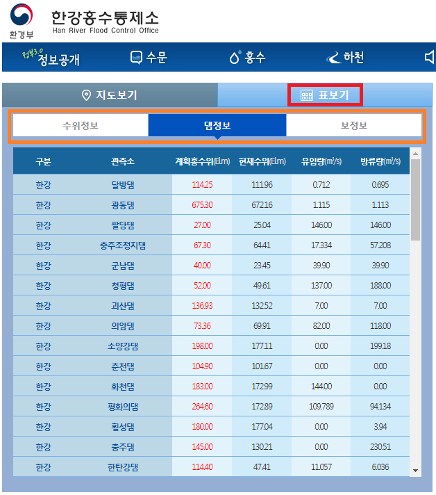 댐 수위 관련 정보 확인 방법