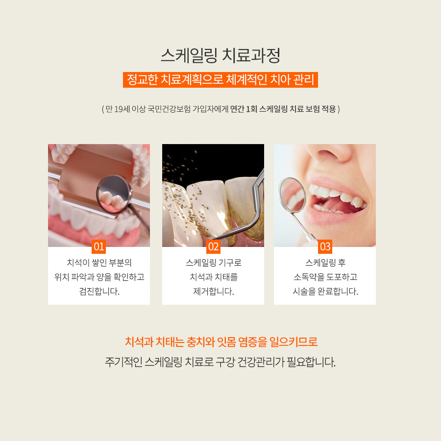 • 스케일링 : 치석을 제거하여 잇몸 건강을 회복합니다.