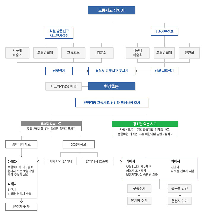 위에서 경찰 조사와 그 후의 절차를 확인하실 수 있습니다. 사고의 경중에 따라 처리가 달라질 수 있으므로, 상황에 맞는 대응이 필요합니다.