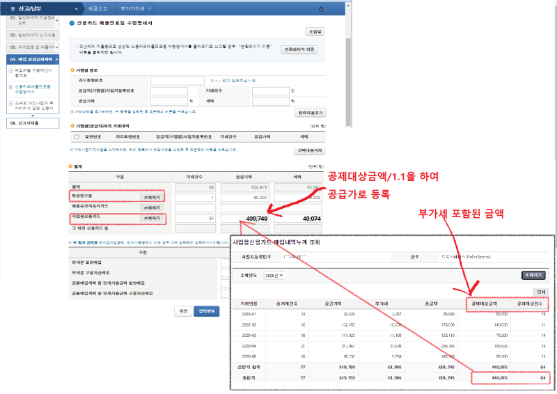 - 세액 계산 : 매출액 중 부가세를 포함한 금액에서 매입세액을 차감하여 세액을 계산합니다.