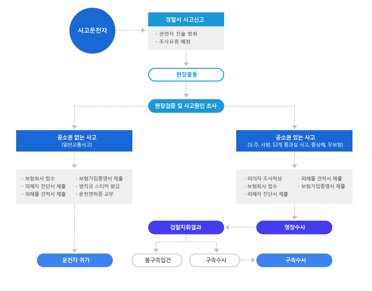 위에서 경찰 조사와 그 후의 절차를 확인하실 수 있습니다. 사고의 경중에 따라 처리가 달라질 수 있으므로, 상황에 맞는 대응이 필요합니다.