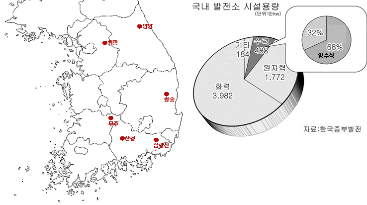 이 지도는 우리나라의 수력발전소 위치를 한눈에 보여줍니다.